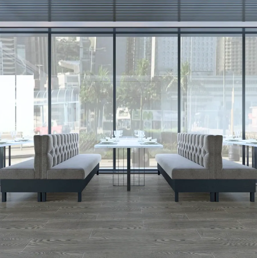 Elegant custom booth seating with tufted upholstery and a minimalist frame, designed for hospitality environments to create a sophisticated dining experience.