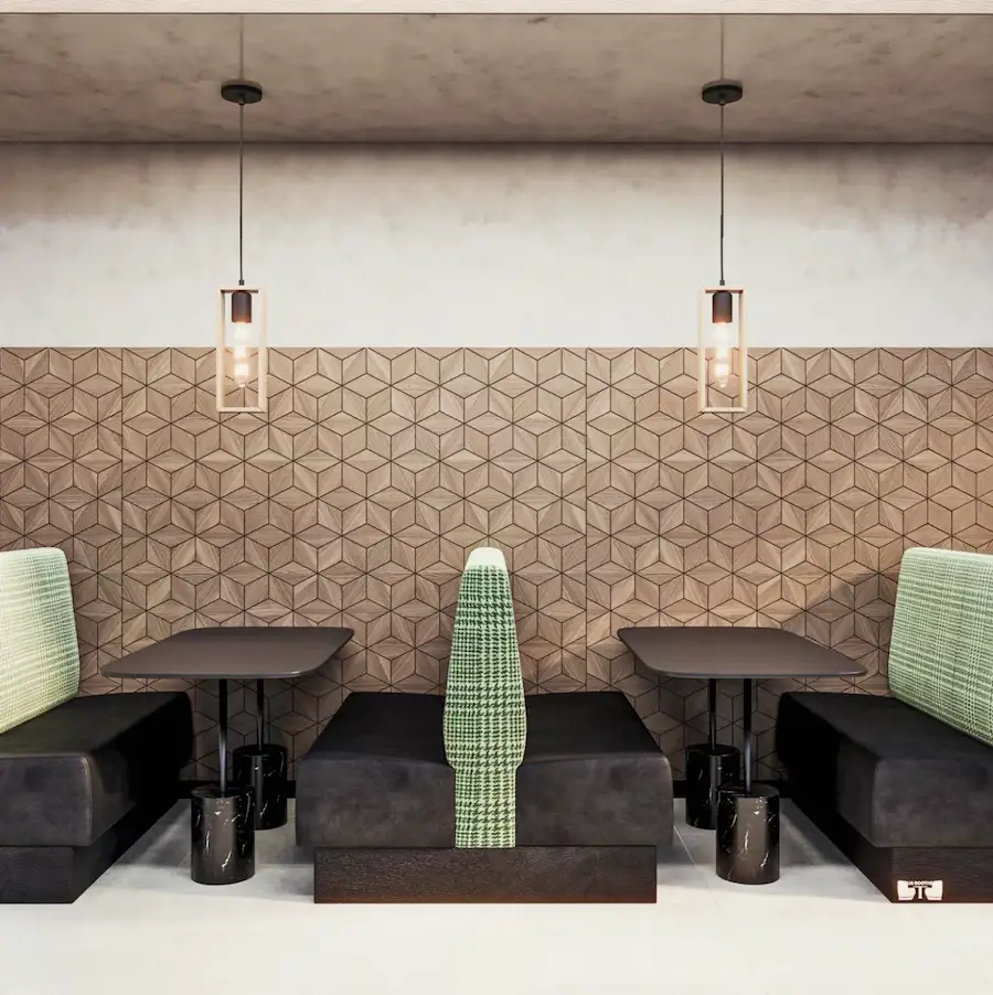 Custom double-sided booth seating with a modern geometric backdrop, featuring contrasting upholstery and clean, structured lines designed to create a refined dining experience.